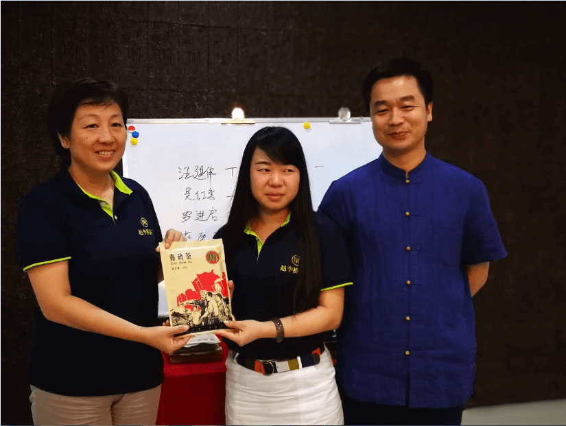 趙李橋茶廠(chǎng)副總經(jīng)理金莉(左) 畢曉軍老師(右一)為本場(chǎng)培訓(xùn)最佳學(xué)員劉露(中)頒獎(jiǎng)